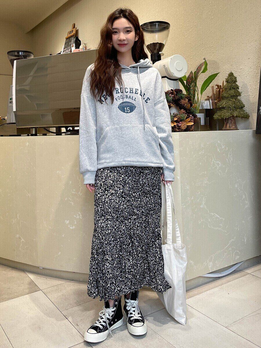 人気のパーカーを組み合わせたコーデです。足元は、ハイカットのスニーカーを合わせることでおしゃれ上級者に!カジュアルな装いも、花柄スカートを合わせることでお出かけスタイルになります。