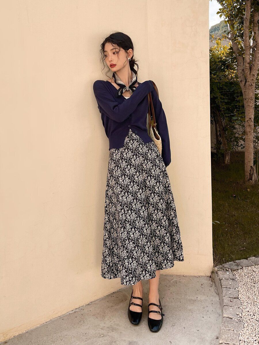 クラッシックな大人のファッションです。花柄スカートにネイビーのカーディガンを組み合わせることで、コーデはまとまりますが、更にスカーフを足すことで上品な装いになります!