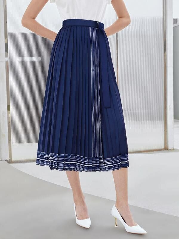 ストライプがアクセントになっている紺色のプリーツスカートは、白いトップスやパンプスとの相性は抜群。フォーマルできれいめな印象になるので、通勤コーデとしても◎。