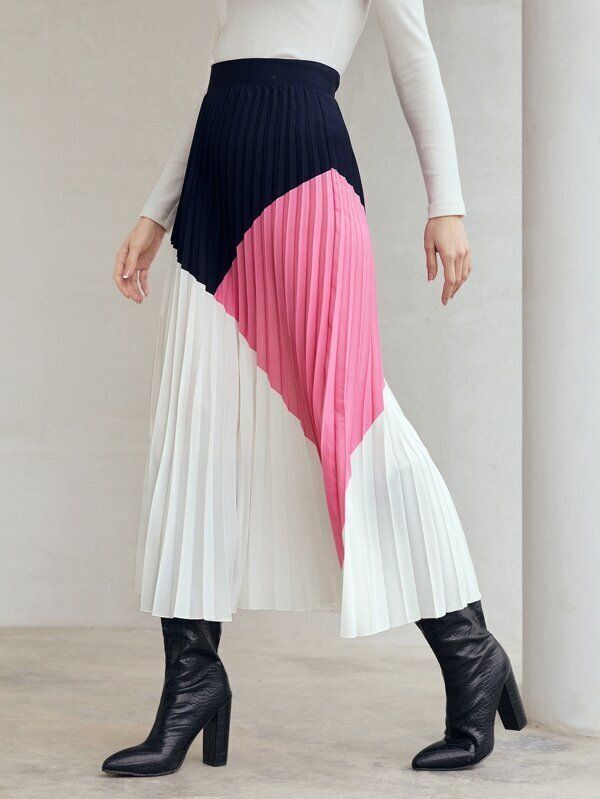 ピンクやネイビーのカラーが入った目を惹くデザインのプリーツスカートは、白いトップスなどと合わせてシンプルに着こなすのがおすすめ。トップスをインすれば、スカートのデザインがさらに引き立ちそうですね。