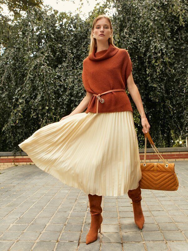 ブラウンカラーで少し大きめのプリーツの入ったスカートは、白いブーツや白いトップスと合わせて軽い印象で着こなすのもおすすめ。バッグも白にしてみるとよいかもしれませんね。