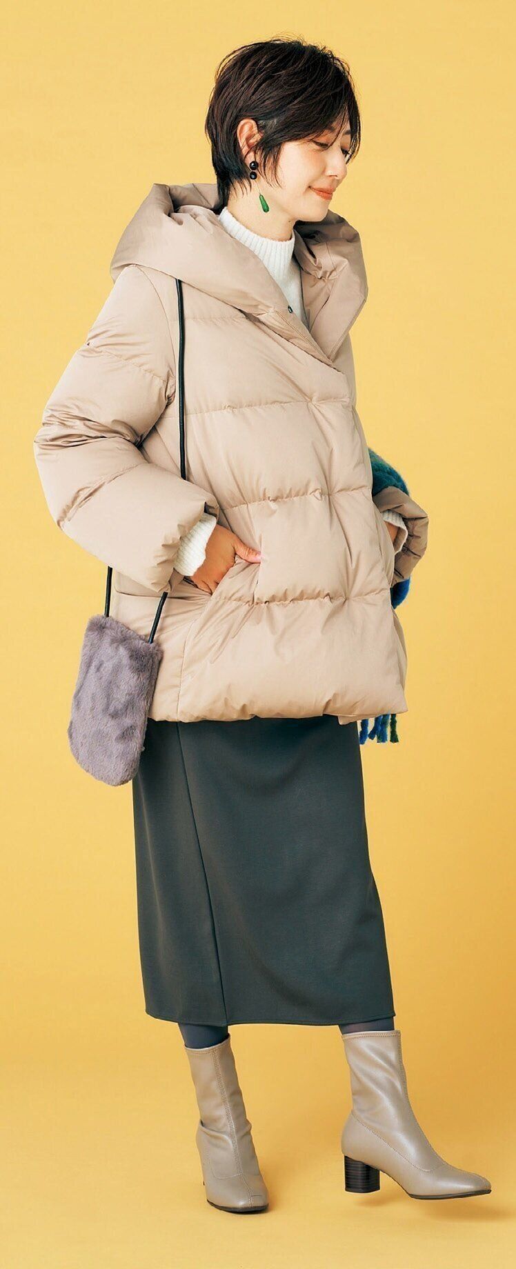 全身落ち着いたトーンでまとめた大人のダウンスタイル。タイトスカートでグッと細見え。「スフレヤーンモックネックセーター」(オフホワイト、グレー、ベージュ、ダークグリーン、パープル・全5色)¥2,990、「ストレッチダブルフェイスナロースカート」(ダークグレー、ブラック、ワイン、ダークグリーン・全4色)¥1,990、「フラッフィーミニショルダーバッグ」(グレー、ナチュラル、ベージュ・全3色)¥1,500、「ストレッチショートブーツ」(ベージュ、ブラック・全2色)¥4,990※一部店舗のみで販売/ユニクロ その他私物