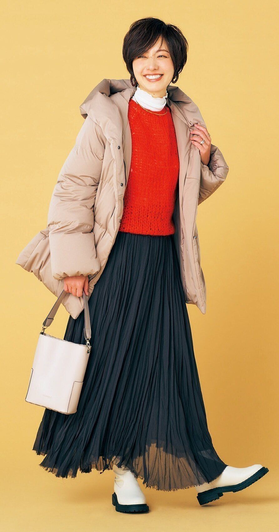 トレンドカラーのオレンジを差し色にして、パッと明るく。白のタートルネックとブーツでいっそう軽やかな印象に。ロングスカートはチュールタイプを選ぶとダウンとの相性◎。コート以外すべて私物