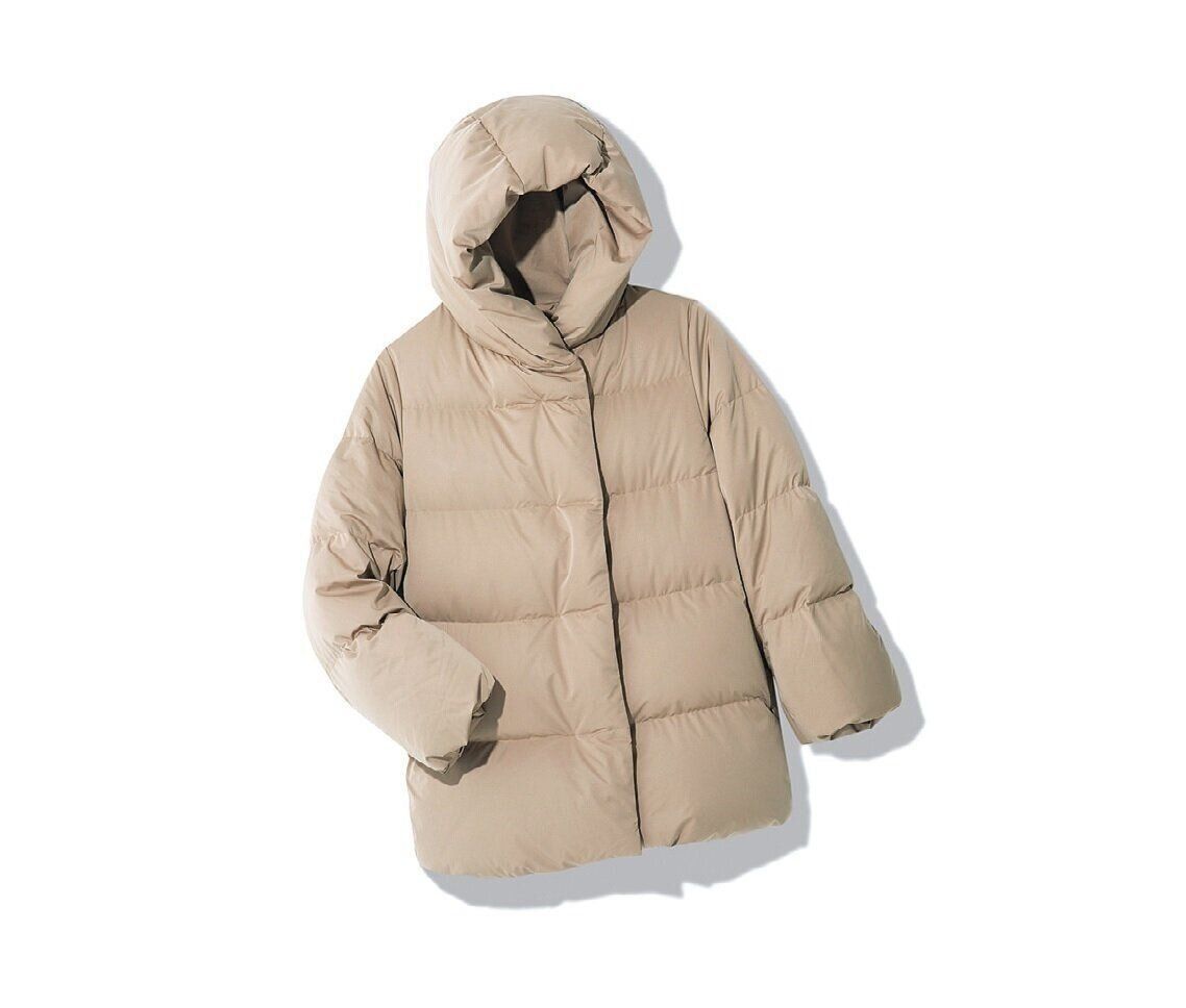 微光沢で柔らかい素材感。「パウダーフィールダウンショートコート」(ベージュ、グレー、ブラック、ナチュラル、ダークブラウン・全5色)/ユニクロ