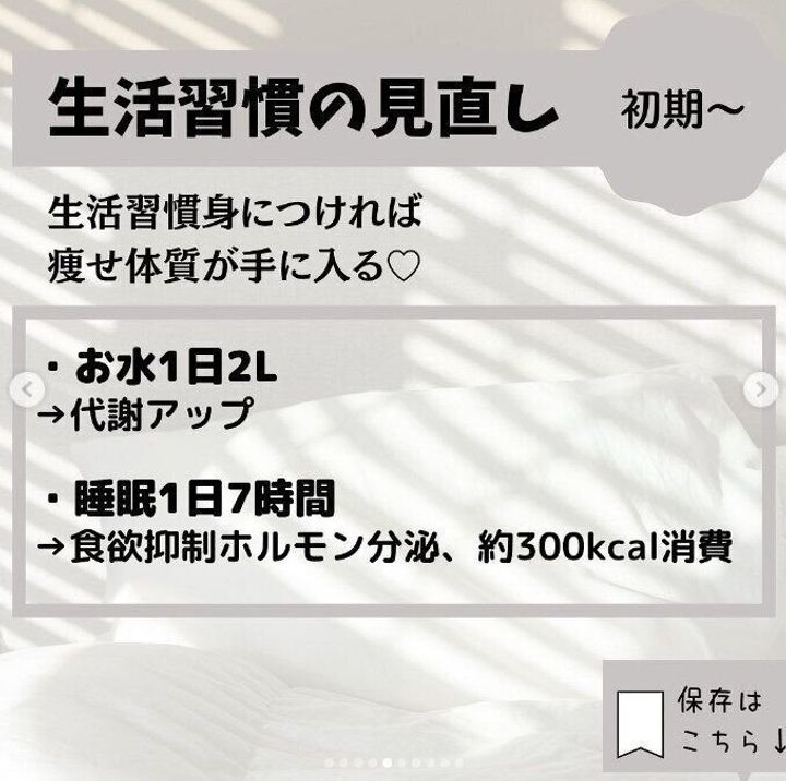 次に、お水を飲む、睡眠時間を確保するなど、生活習慣を改善することも必須です。燃えやすい体になるための生活習慣を身につけていきましょう。