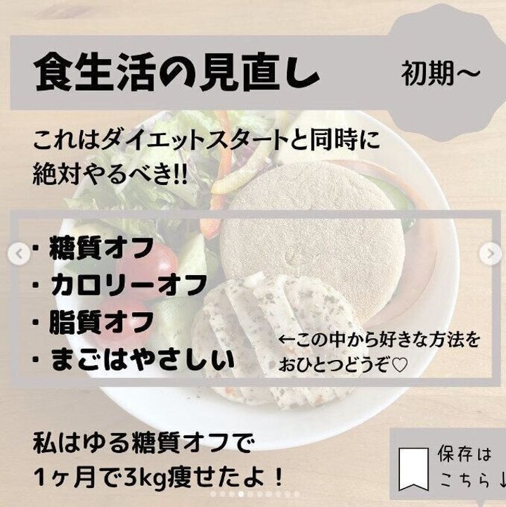 まずは食生活の見直しから。ダイエットスタートと同時に始めてほしいといいます。「糖質オフ」「カロリーオフ」「脂質オフ」「ま(豆類)ご(ごま)わ(わかめ・海藻類)や(野菜類)さ(魚)し(しいたけ・キノコ類)い(イモ類)」などいろいろありますが、自分にあったものを選び、食生活を見直してみましょう。ちなみにchiiiimam48さんは、「ゆるい糖質オフ」をして1カ月で3kgの減量に成功しました。