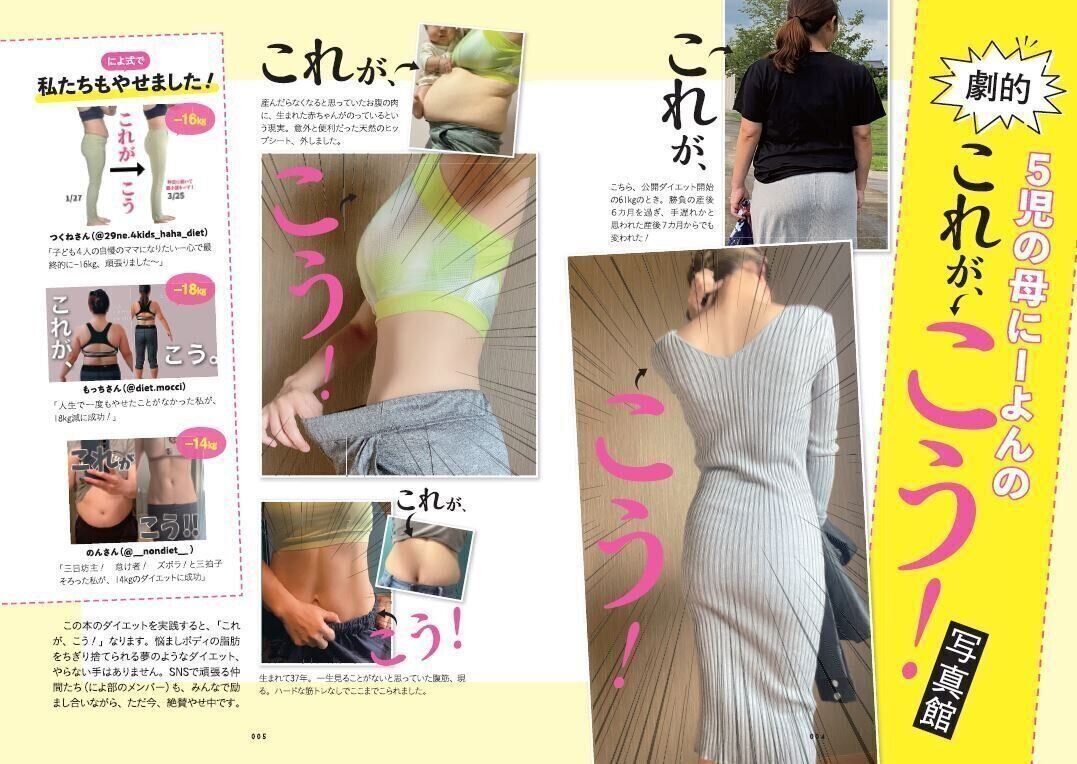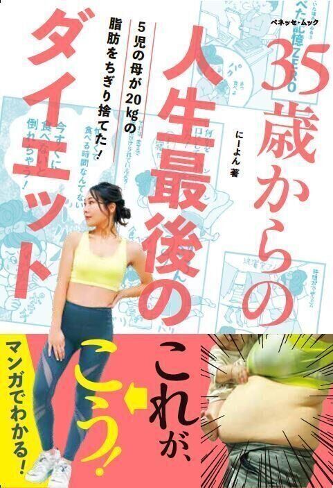 「お正月太りを今すぐどうにかしたい!」「今年こそはダイエットを成功させたい!」人におすすめしたい、5児の母でありながら、子育てに家事に仕事に奔走しながらも最終的には20kgの体重を落とした人気インスタグラマーのにーよんさんのダイエットムックが1月10日に発売します!子育て中でもゆるく頑張れる食事作りのコツ&レシピ、そしてつらくない最小限の運動まで、ラク~に脂肪をちぎり捨てるテクニックが満載。にーよんさん自身の経験から、なぜやせないのか?そして、どうしたらやせられるのかをわかりやすく、楽しくマンガで伝えます。お正月太りに悩む人は必見の1冊です。
