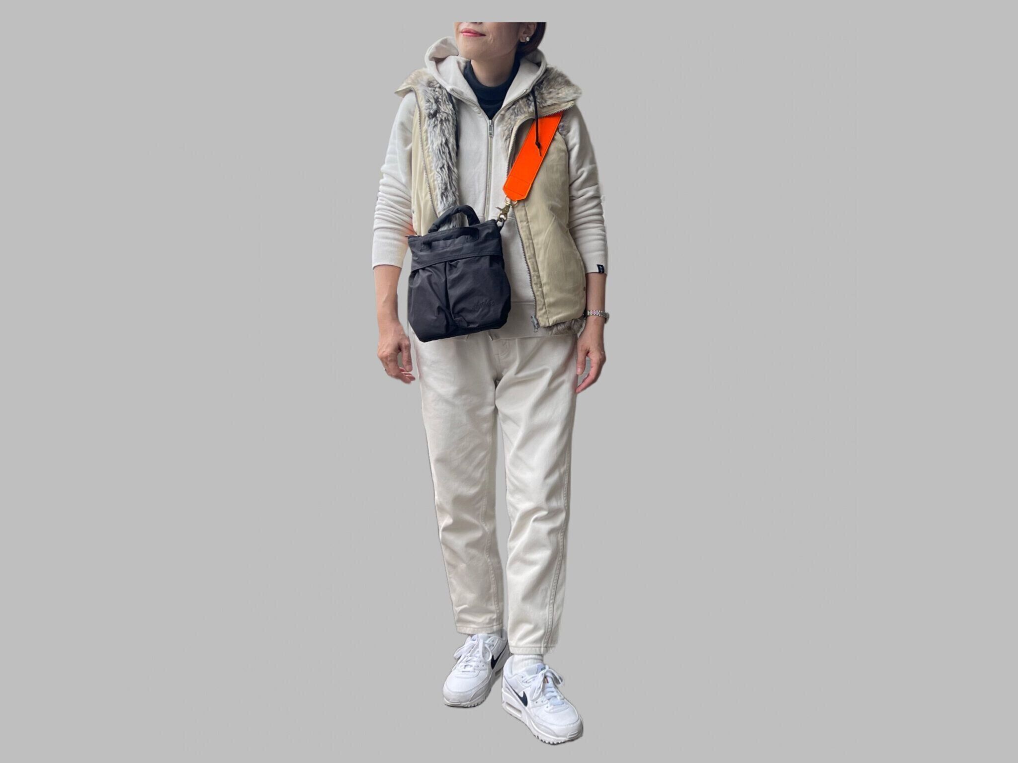 このくすまない真っ白のお陰で清潔感を出すことが出来て、個性的なベストもすっきり!ワントーンコーデが完成しました。