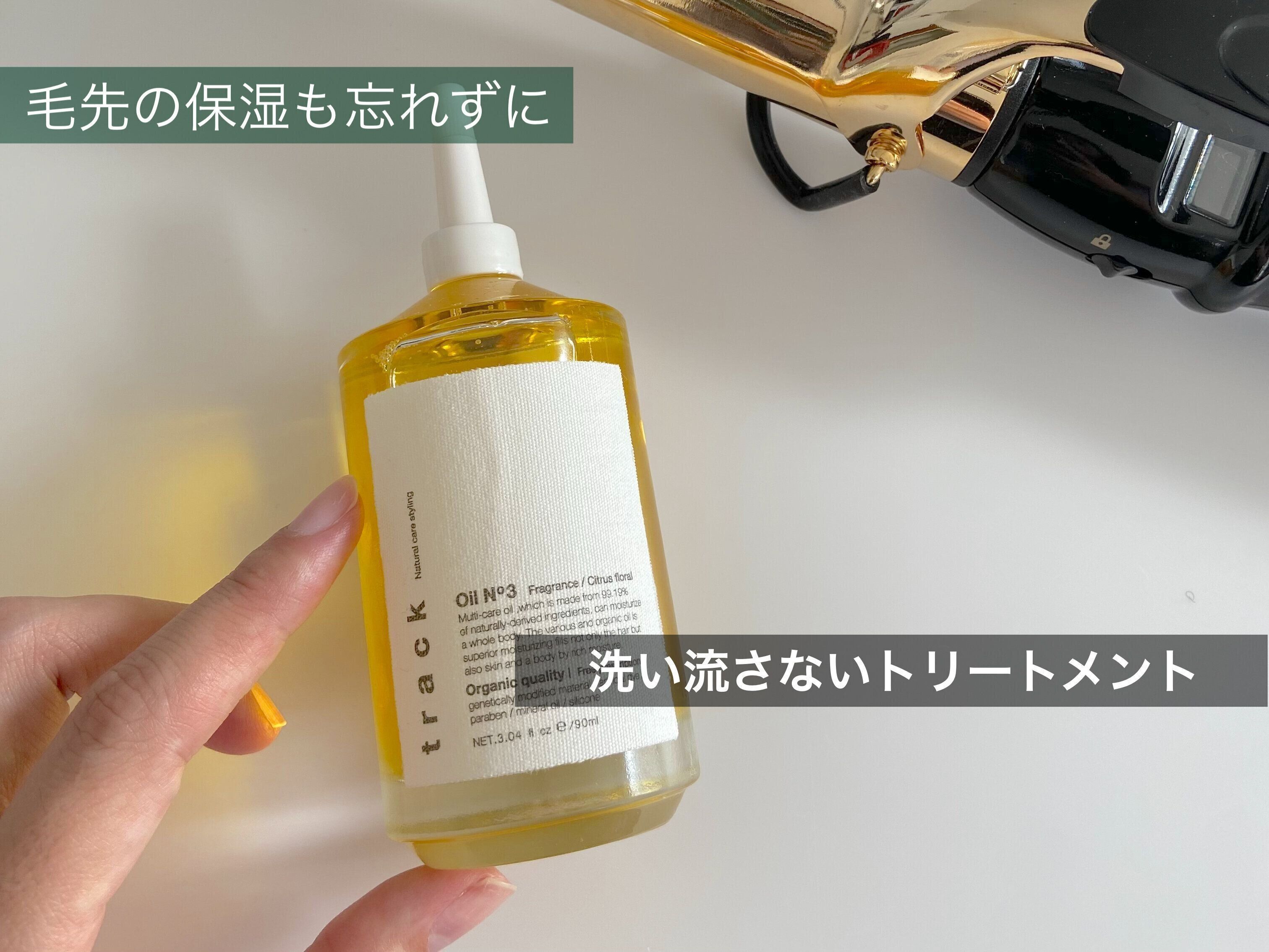 私のおすすめは、乾かす前にはミルクタイプの洗い流さないトリートメントを中間から毛先へ、8割ほど乾いてきたら毛先を中心にオイルタイプのトリートメントを少量つけて9割ほど乾かすと、しっとりとまとまりのある髪になりやすいです。