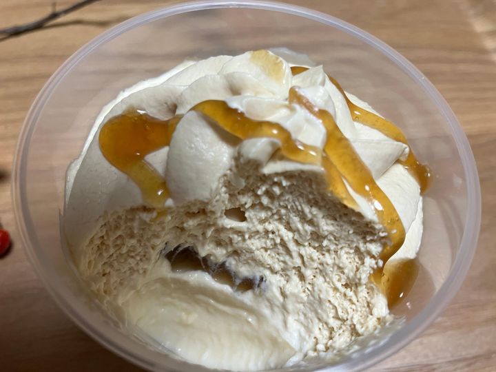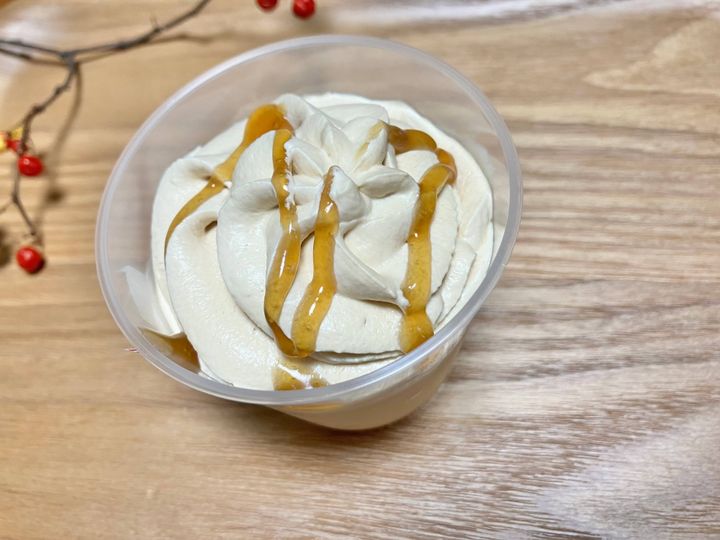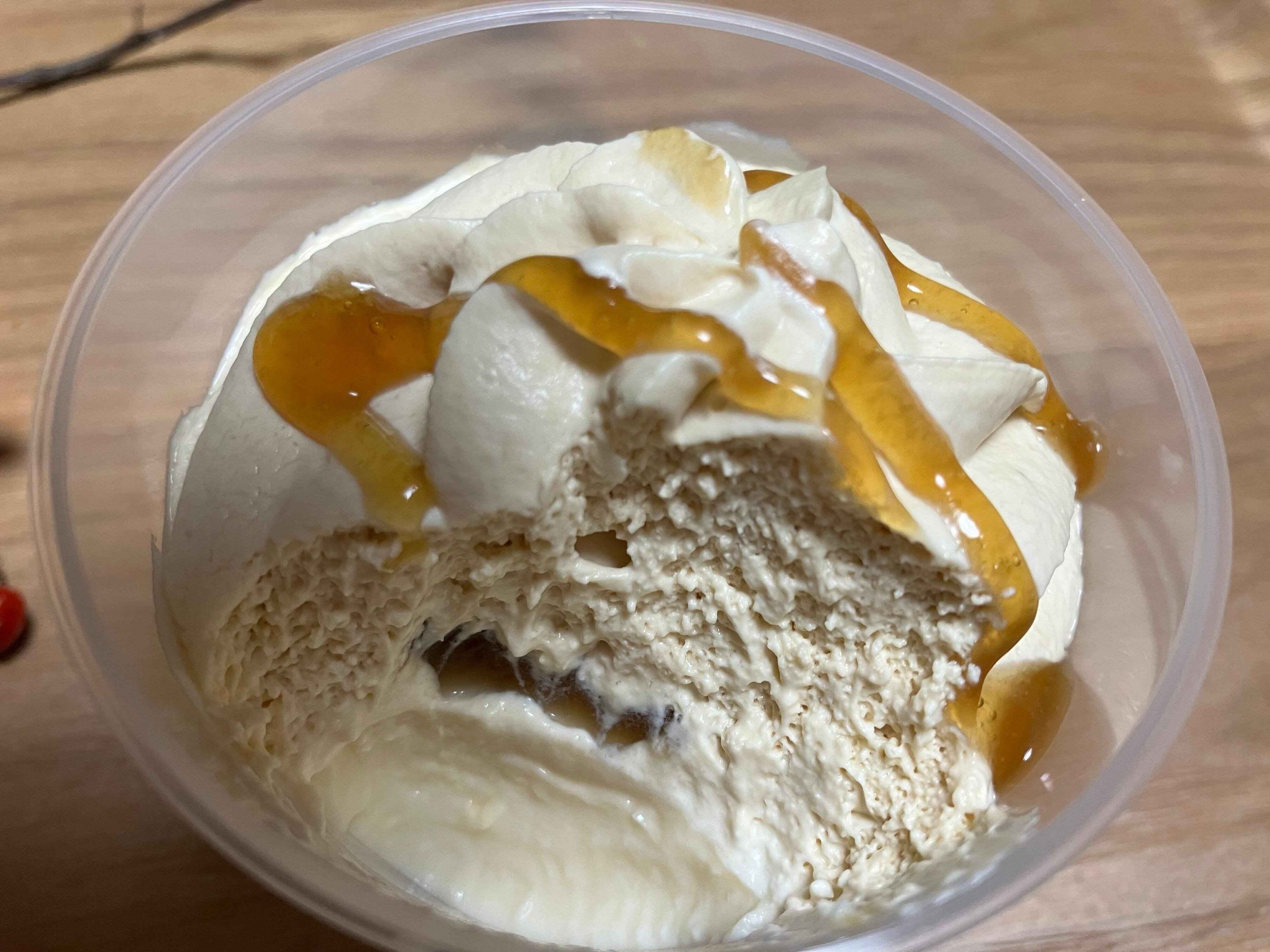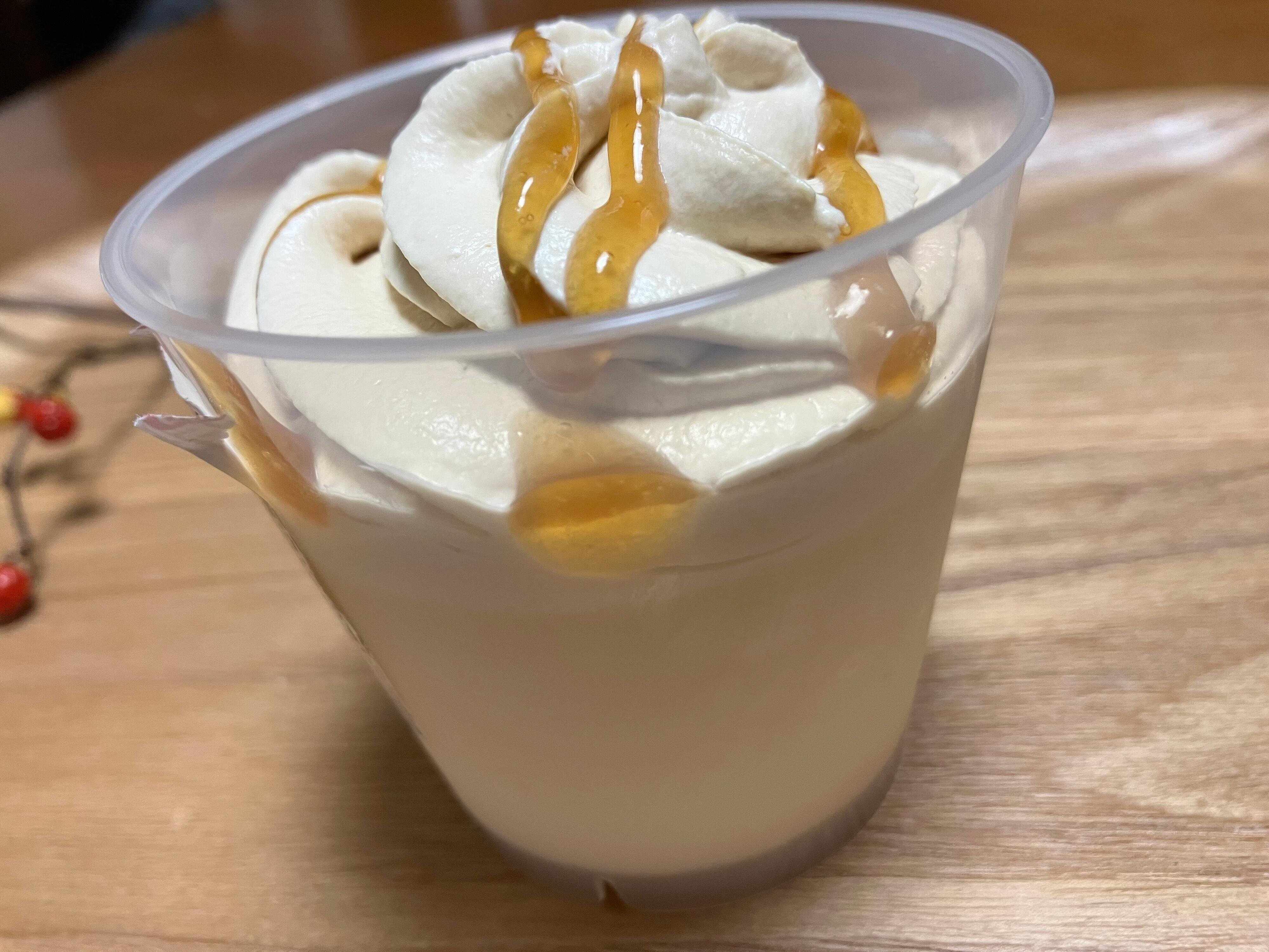 蓋を開けてみると、ソース、クリーム、プリンがしっかりと確認できます。みたらしミルクプリンなので、全体的にベージュ色のような色合い。プリンの上にもたっぷりとホイップクリームがのっています。