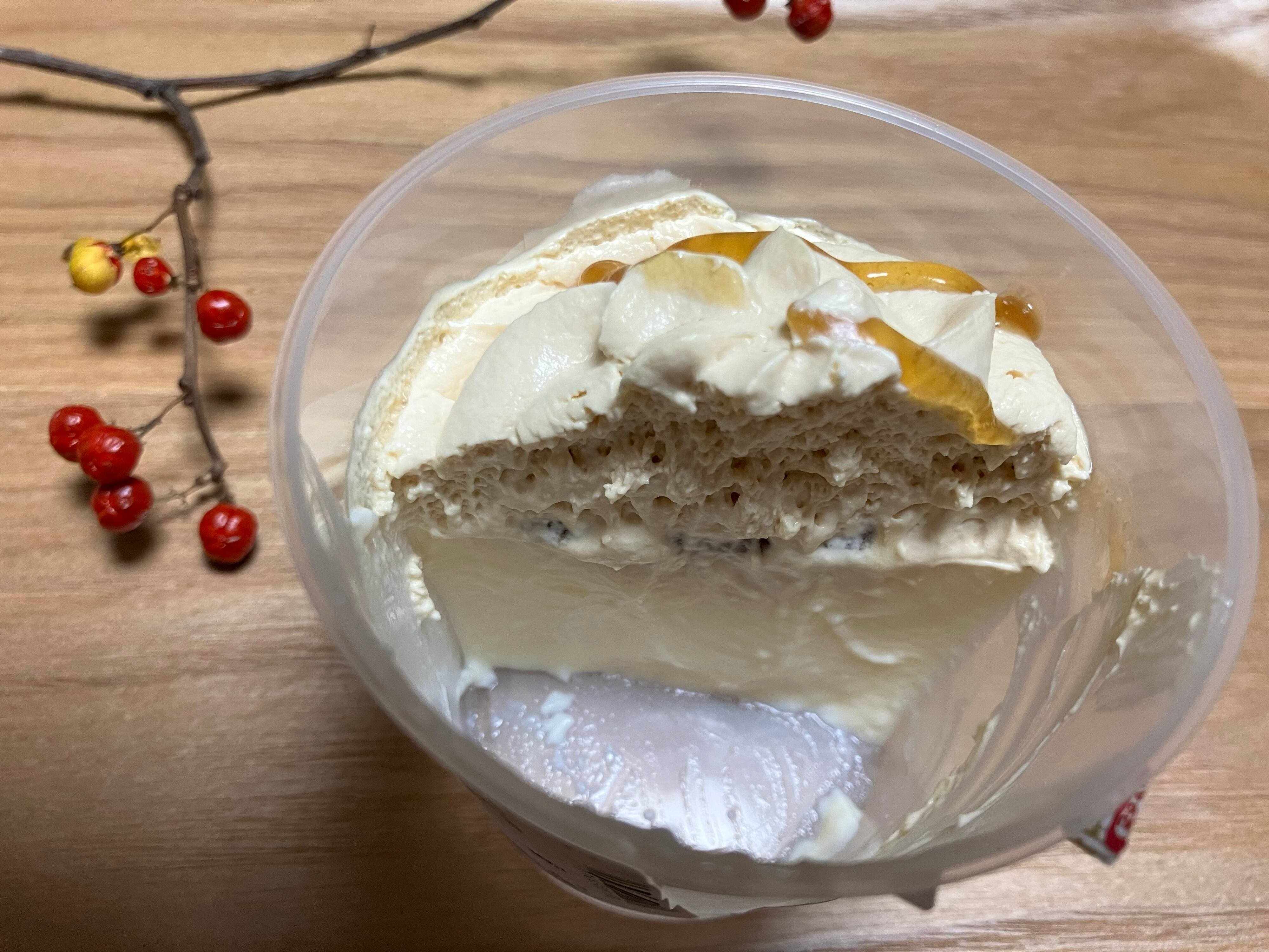 断面図からもホイップクリームが沢山乗っていることわかります。クリームは見た目の通り、口に入れるととろける感じ。ホイップクリームが沢山ある分、ミルクプリンが少ないということはなく、沢山入っているのでプリンもしっかり味わうことができます。