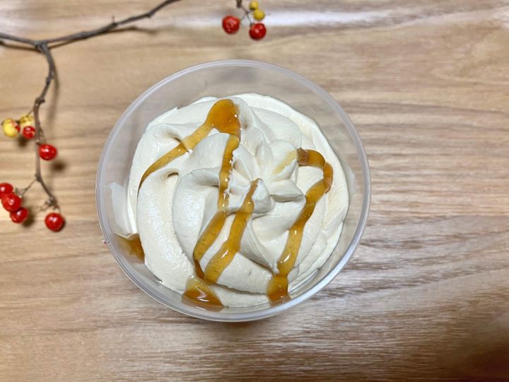 みたらし団子のタレと同じように艶々したみたらしソースが、ホイップクリームの上にかけられています。