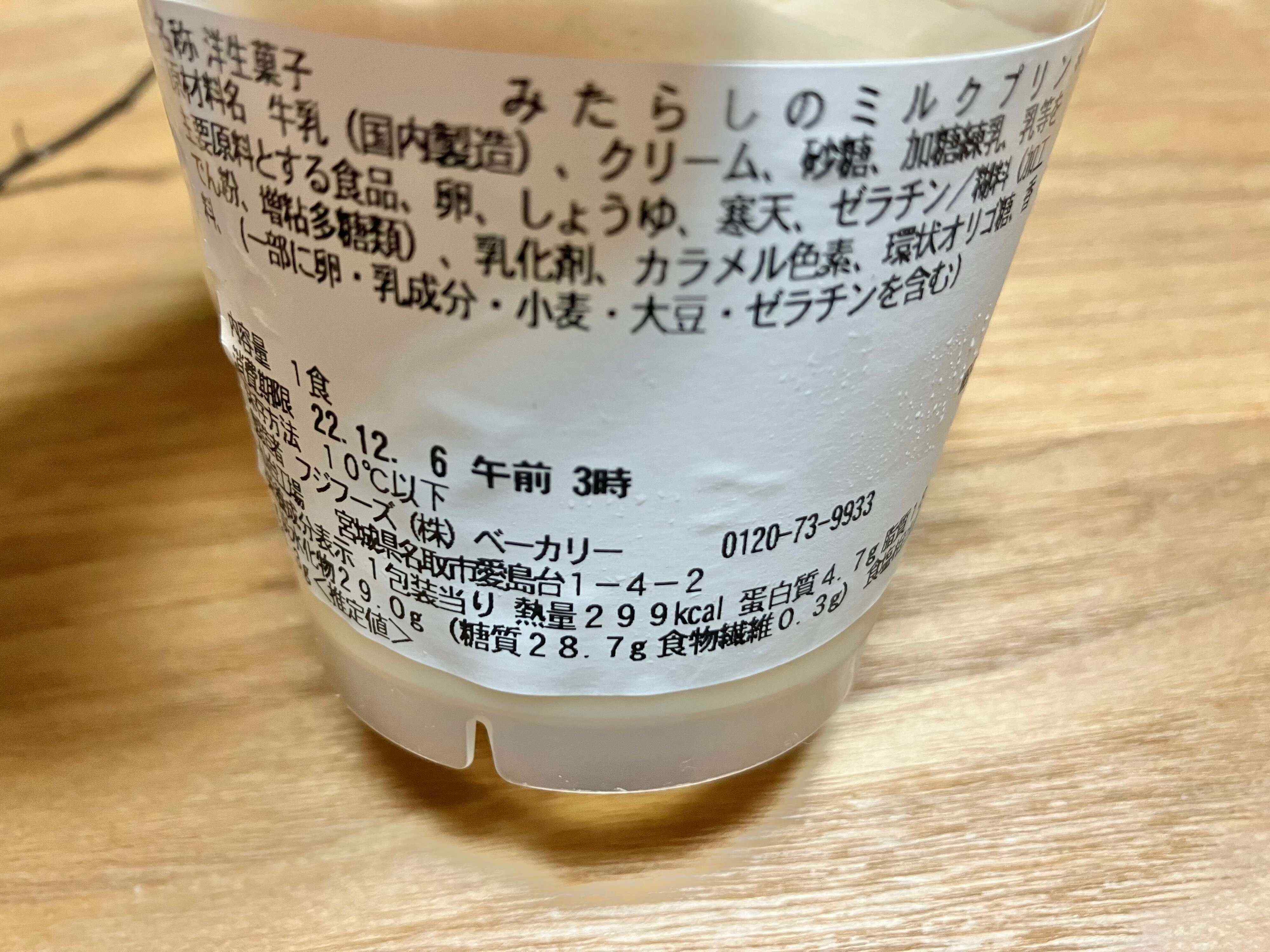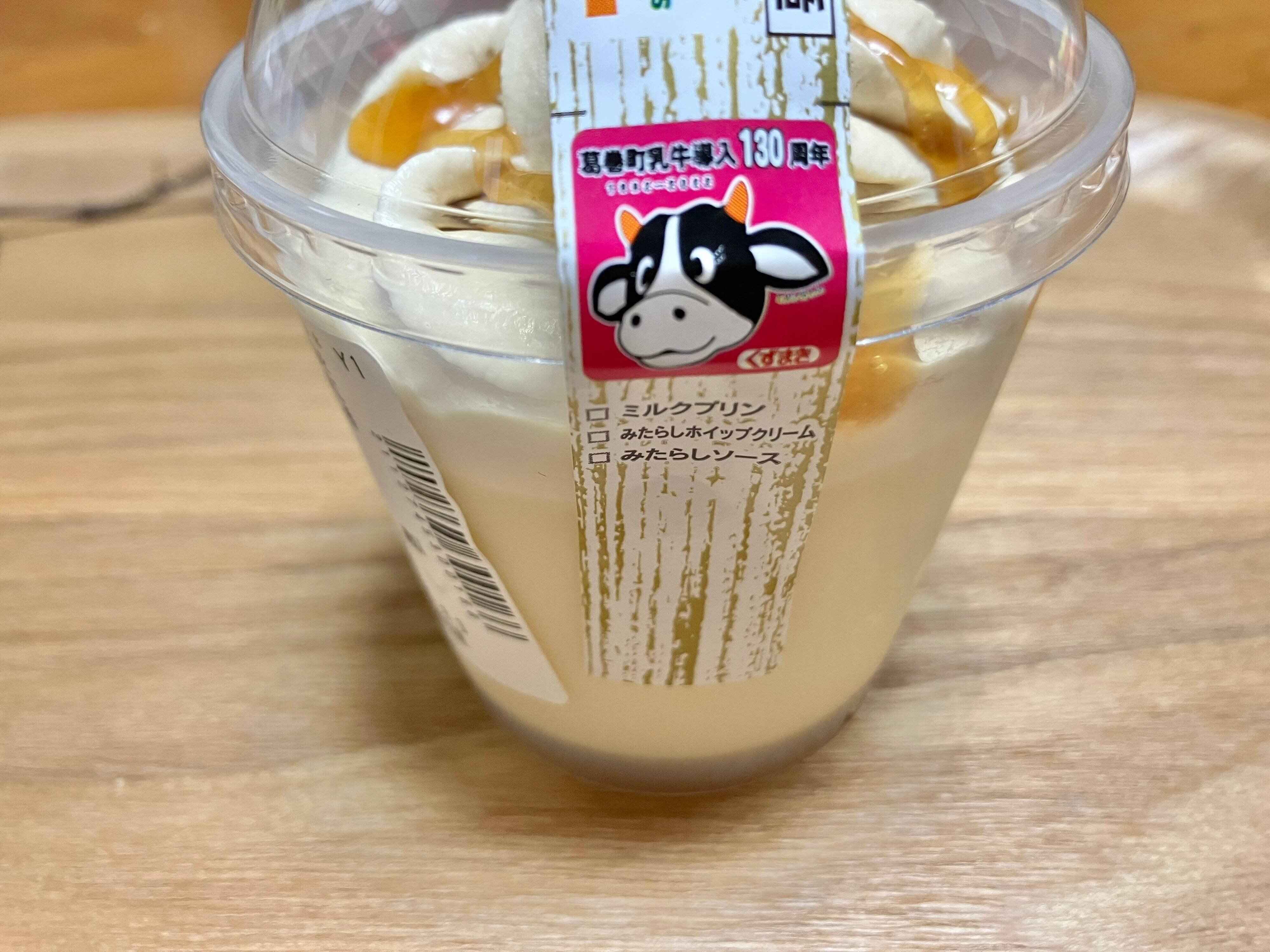 プリンの中身が記載されているのですが、実際の中身の順番は上下逆で一番下がミルクプリンになっています。みたらしホイップクリームが気になります。
