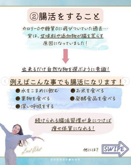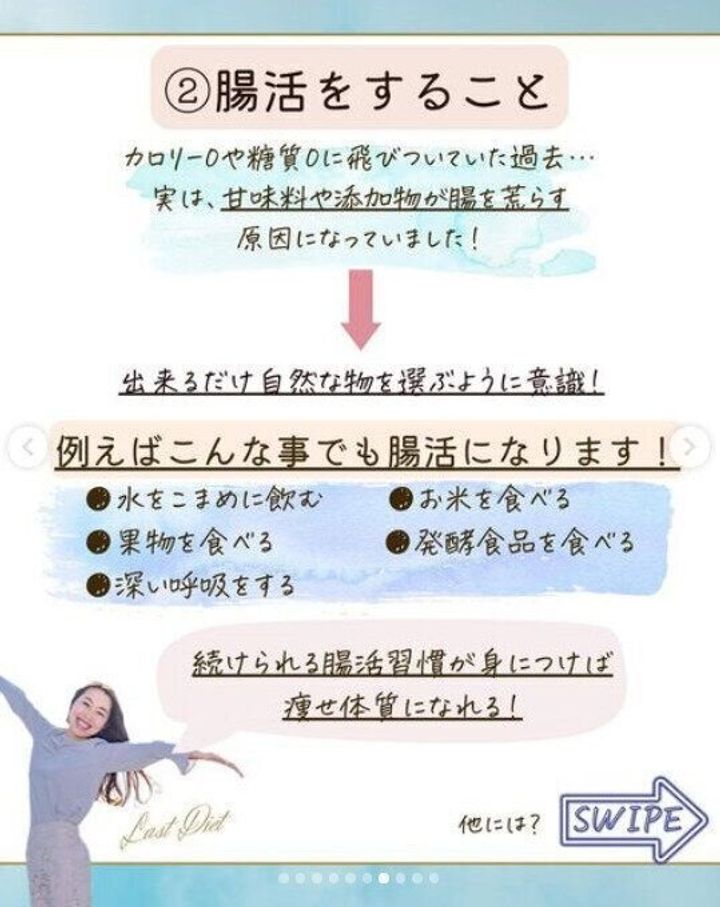 適度な運動や食生活の改善で腸内環境を整えていく「腸活」を取り入れていきましょう。aya_sango.dietさんも、甘味料や添加物が腸内環境を荒らすと知ってからは、できるだけ自然なものを選ぶように意識しているのだそう。「腸活」というとむずかしいイメージがありますが、「水をこまめに飲む」「お米を食べる」「果物を食べる」「発酵食品を食べる」「深い呼吸をする」なども「腸活」につながるといいます。