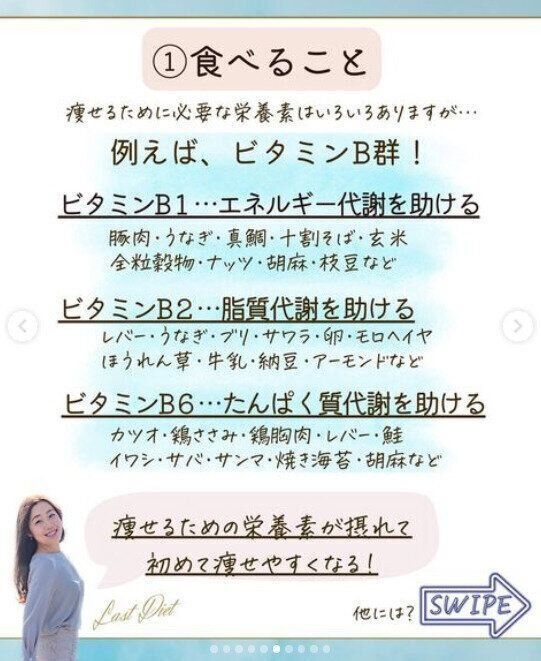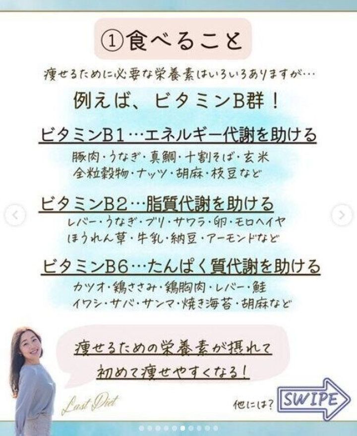 食事の大切さを伝えているaya_sango.dietさん。ダイエットに必要な栄養素はいろいろありますが、たとえばビタミンB群について学びましょう。豚肉やうなぎなどのビタミンB1は、エネルギー代謝を助けてくれる働きが。レバーや卵、ほうれん草などのビタミンB2は脂質代謝を助けてくれます。そしてカツオやささみなどのビタミンB6は、タンパク質の代謝を助けてくれます。栄養が足りないと代謝はあがりません。痩せるための栄養素をとることで痩せやすい体になっていくのです。