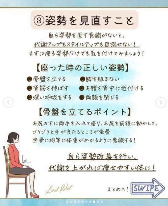 自分で姿勢を正す意識がないと、代謝アップもスタイルアップも目指せないとaya_sango.dietさんはいいます。まずは座る姿勢だけでも意識してみるといいそうですよ。足を組まない、背筋を伸ばす、深い呼吸をする、両膝を閉じるなどポイントをおさえて。自分で姿勢の改善を行い、代謝を上げることで痩せやすい体質につながるのです!