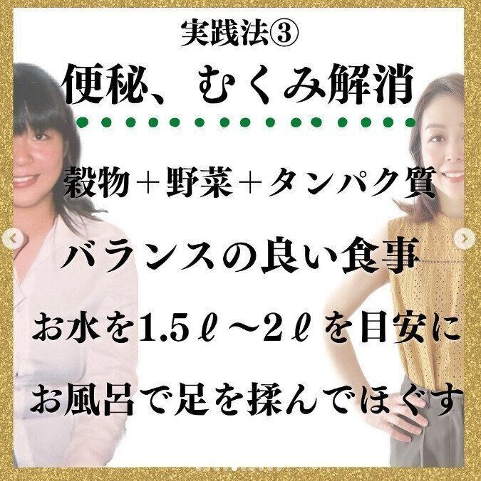 食事は、穀物、野菜、タンパク質をバランスよくとること。またお水を1.5L~2Lを目安に飲んでみましょう。お風呂に入ったときは、足をもんでほぐすこともおすすめ。