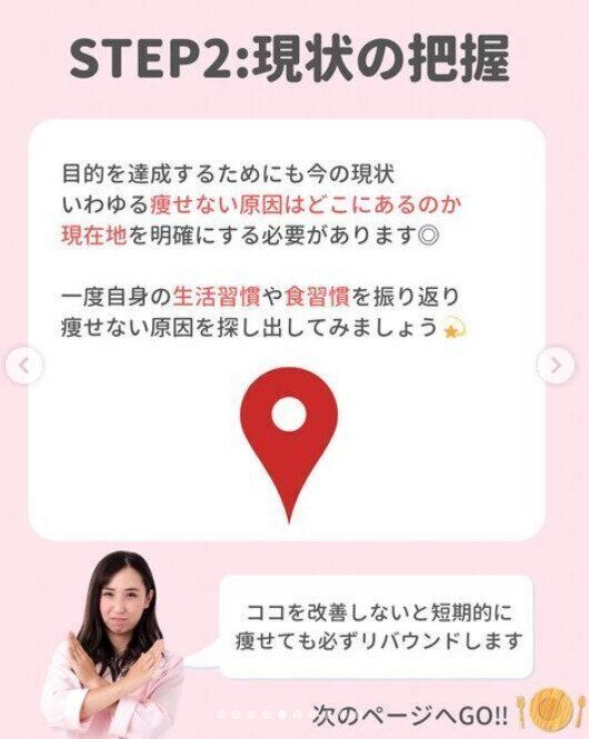 決めた目的を達成するために、次のステップです。それは、今あなたが太ってしまった原因、痩せない原因は何かを知ること。自分自身の生活習慣や食習慣を振り返ってみましょう。「間食が多い」「食べる量が少なすぎて、代謝が落ちている」「ジャンクフードが好きで脂をとりすぎている」など、痩せない原因はどこかに必ずあるといいます。ここを改善するダイエットをしないと、痩せたとしても必ずリバウンドするとyukiiiii_dietさんはいいます。