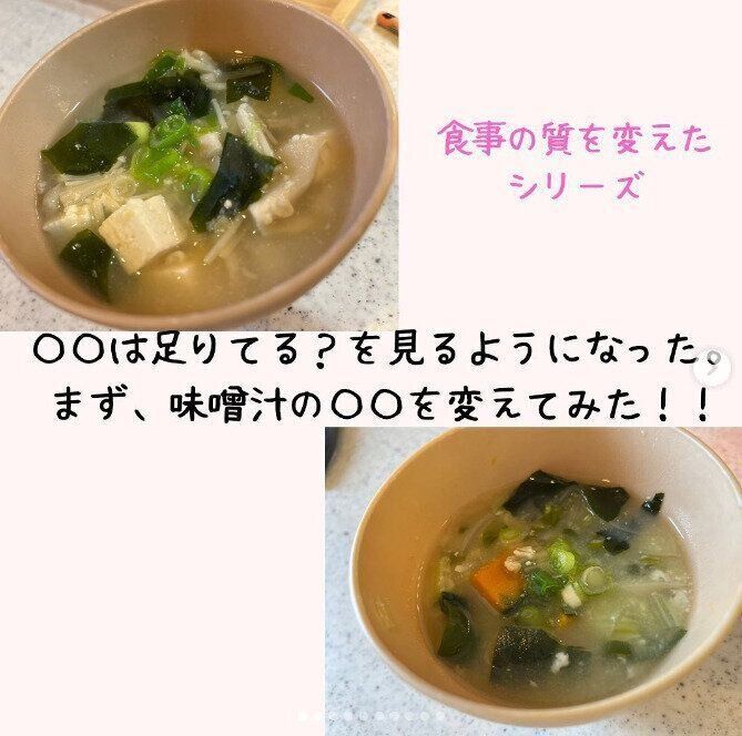 どうやったら野菜を日常的に多くとることができるか。riy_travelさんは、いつも食べている味噌汁を具沢山にする方法を選びました。「もはや、お味噌汁が鍋化している」というほど、数種類の野菜がたっぷりと入っています。さらに冷え性のriy_travelさんは、ショウガのみじん切りを入れることで、体を温める効果も。