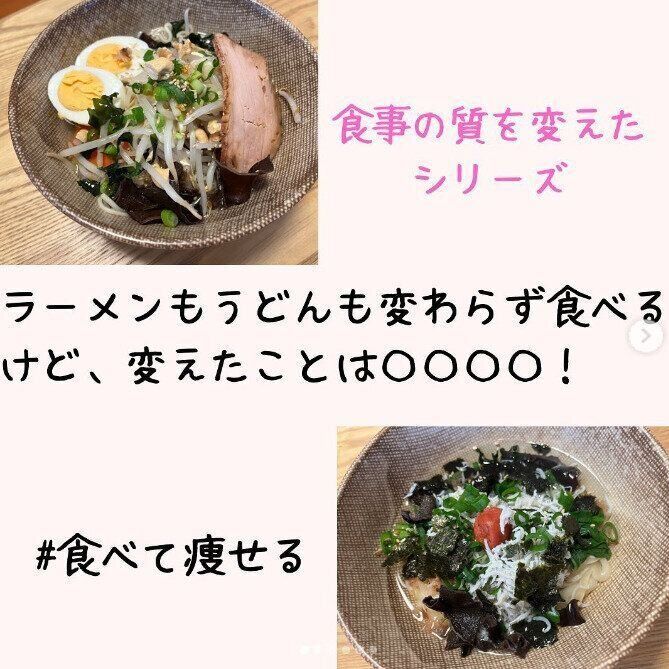 たとえば、こちらの写真はうどんと、ラーメン。ダイエット中の女性たちにとっては「食べてもいいの?」と驚くメニューかもしれません。ただ、ここには大きなポイントが。それが栄養バランスを考えて具材を増やしていること。海藻などもふくんだ野菜たっぷり、卵などのタンパク質も入れて、やや麺は減らしているのもポイント。満足感も大きく、これだけで十分に食事を楽しむことができるのです。