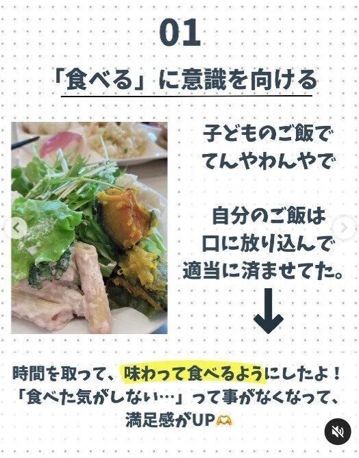 ふだんの食事には時間を取って、味わって食べることを意識したmyaaarepoさん。「食べた気がしない…」ということがなくなり、満足感がアップしました。
