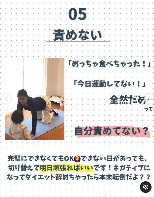 「食べすぎてしまった」「なにも運動ができなかった」など自分を責めてばかりいませんか?ネガティブな気持ちになってしまい、そこでダイエットをあきらめてしまっては本末転倒。「完璧にできない日があってもOK。切り替えて明日がんばればいい!」とmyaaarepoさんはいいます。