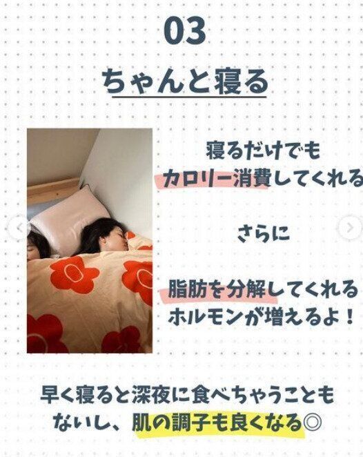 自分の時間がなかなか取れない子育て中。つい夜更かしをしてしまっているママも多いですよね。myaaarepoさんは、「しっかりと寝る」ことを心がけています。寝ることとダイエットに関係があるの?と思いますが、寝ているだけでもカロリーが消費されて、脂肪を分解してくれるホルモンも増えるのだそう。早く寝てしまえば、深夜にお腹がすいて食べてしまうこともなくなり、肌の調子もよくなったそうですよ!