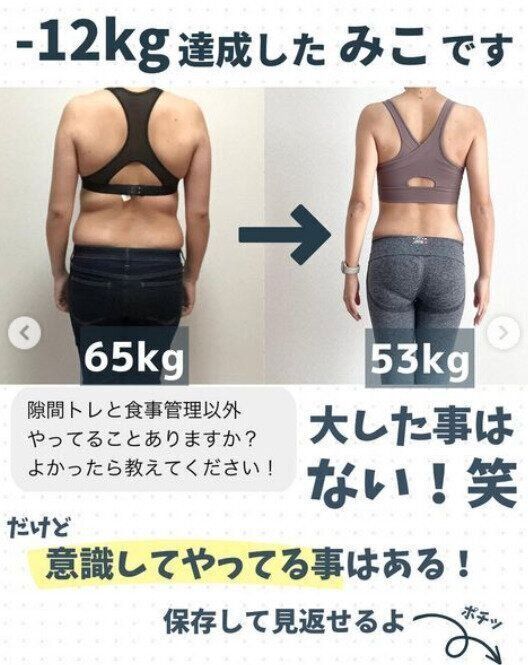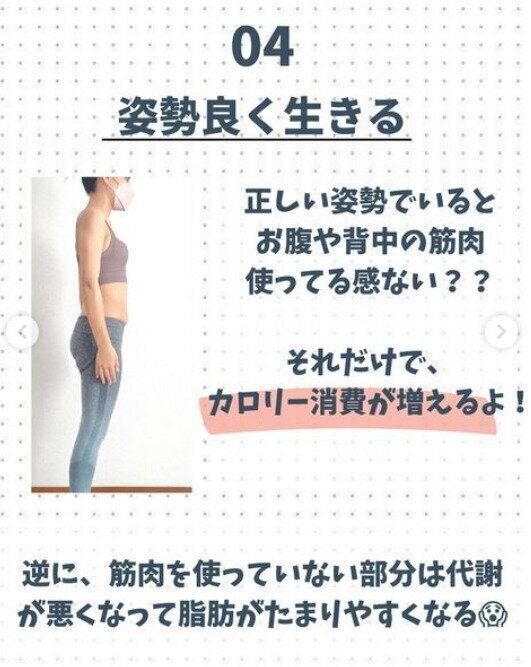 「正しい姿勢で立っているだけでお腹や背中の筋肉を使っている感じがしますよね?」とmyaaarepoさんはいいます。正しい姿勢をたもつことで、カロリー消費量もあがるといいます。逆に筋肉を使っていないと、代謝は悪くなり脂肪がたまりやすくなるのだとか。ビフォーアフターの写真でも、姿勢の美しさが際立っていましたが、こういった意識の変化もあったのですね。