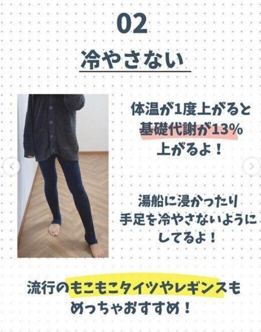 体温が1度あがると、基礎代謝が13%もあがるのだそう!お風呂のときは湯船につかったり、手足を冷やさないようにタイツやレギンスを履いたり、体を冷やさないように意識をしています。
