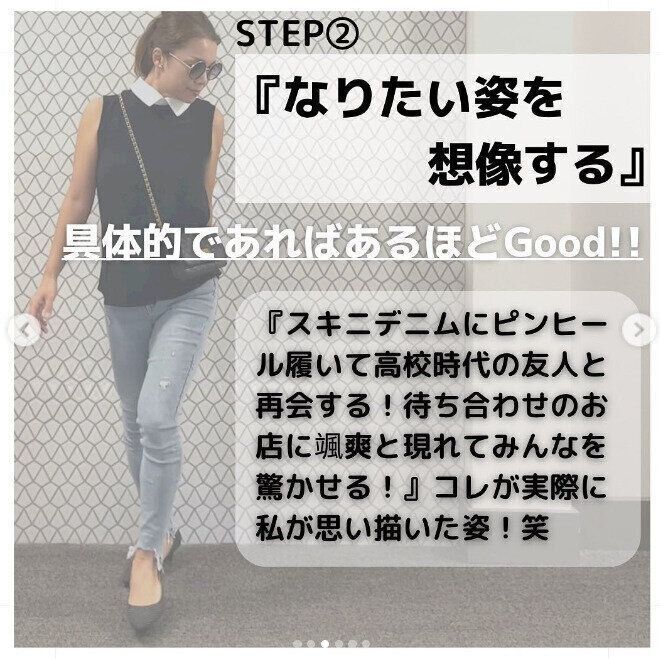 ステップ2として、自分がなりたい姿を想像し書き出しました。「スキニーデニム、ピンヒールを履いて高校時代の友人の前に颯爽とあらわれる!」といったように、具体的な目標を立てることがおすすめなのだそう。