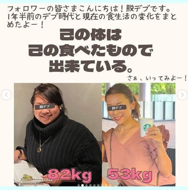 こちらが、ビフォーアフターの写真。1年半で人はここまで変われるのかと驚きです。ただ痩せただけではなく、健康的でお肌までツヤツヤ。誰もがうらやむキラキラとした40代です!なにより、これはすべてchange_my_boooodyさんの努力の結果。「生活は体型に出る。だから痩せたいのならば、生活そのものを変えること」が必要になってくるといいます。まずは食生活の変化からみてみましょう。