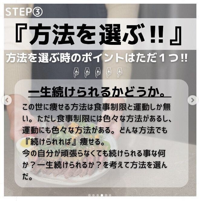 そしてステップ3は、「ダイエット方法を選ぶ」ということ。「痩せる方法は、食事の改善と運動しかない。でも、どんな方法でも、続けられれば痩せる」と考えました。今の自分が一生続けられる方法は何か?まずは、どんなダイエット方法にするかを選びました。目標数字は、あくまで目安。一生続けられる方法を選び、小さくても目標を立てていくことが大切だといいます。「運動は1日5分だけ、でも毎日やろう」「食事は30回は噛もう」など、目標をどんどんクリアしていったことで、大きな結果につながっていったのです。