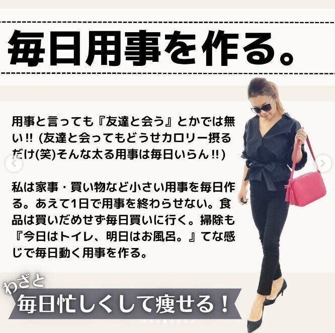 「以前は1日のほとんどをソファでだらだらと過ごしていた」といいますが、現在は、毎日、2万歩を歩く!というのですから驚きです。もちろん運動もしていますが、それだけではありません。移動は常に階段をつかう。買い物などは、あえて買いだめせずに、毎日いく。掃除も「今日はここ。明日はあそこ」など、とにかくこまめに動くことを意識しているのだそう。「ジムや宅トレだけが運動ではない。生活のすべてが運動。過ごしかたを変えれば、わざわざ運動しなくても十分な活動量を稼げる」といいます。ふだんから歩数計を身につけ、活動量をチェックしているのだそう。