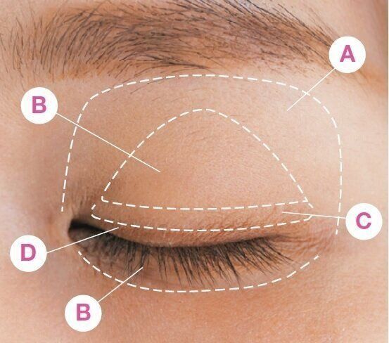 締め色を上まぶたの際にのせて目力をアップ。アイラインを引くイメージで、Dを目の際2~3mmに入れる。