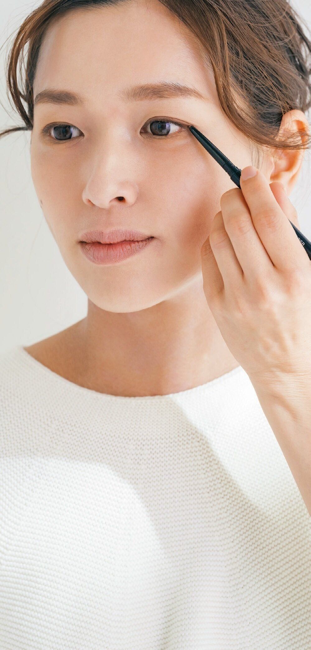 ぼやけた目元を引き締めて目力を高めるにはアイライナーは必須。ペンシルタイプを選び、まつげの隙間を埋めるよう目頭は太めに入れると、今っぽいナチュラルな仕上がりに。