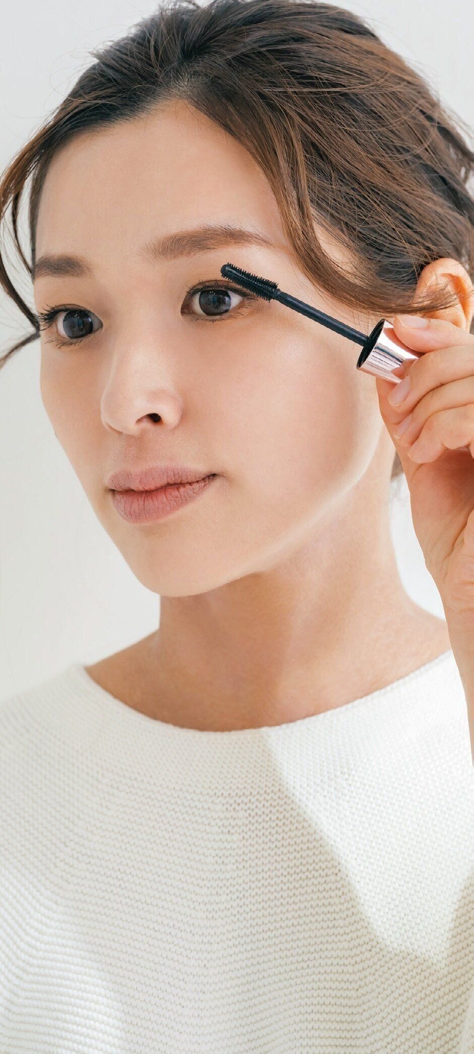 余分なマスカラをボトルの口でしごいて落とし、根元にしっかりつけて、毛先に向かってスーッと抜く。
