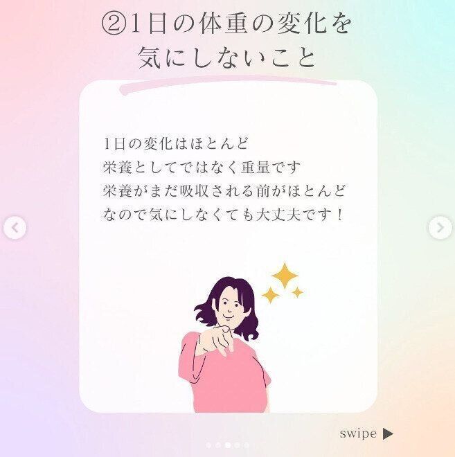 毎日、体重計に乗って一喜一憂していませんか?そしてそれがストレスになっていませんか?「1日の体重の変化は栄養としてではなく重量です。増えていても栄養が吸収される前がほとんどなので、気にしなくて大丈夫。」といいます。