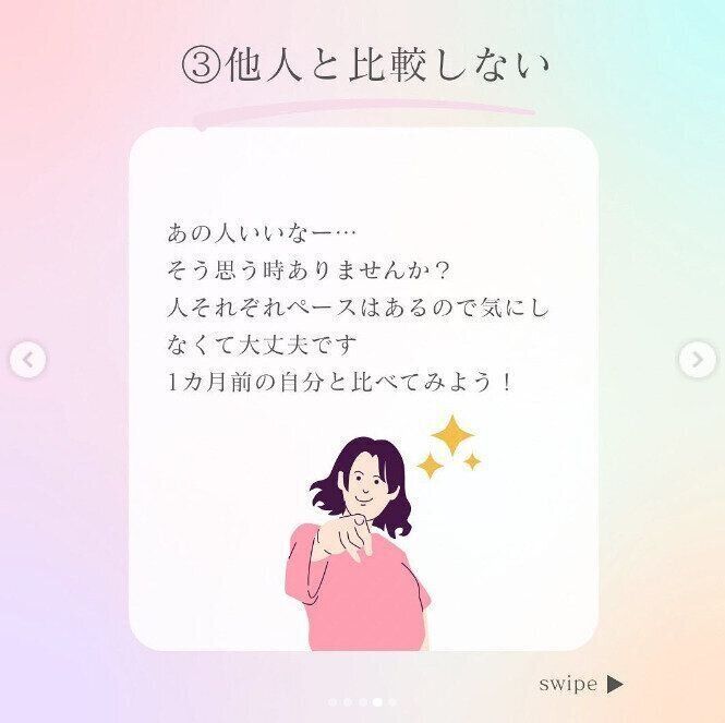 ダイエットに成功した人をみて「いいなあ」と思うこと、誰にもありますよね。でも、人それぞれペースがあるので気にしなくて大丈夫、とjury.jury.homeさんはいいます。比べるとしたら1カ月前の自分と比べてみましょう。ちょっと変化が出ていませんか?「素敵な成長をみつけて自分を認める」といいのだそう!