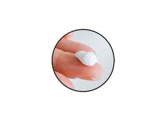 大きめパール粒大の日焼け止めを指先に出し、第二関節までのばす。ペタンペタンとスタンプを押すように、白っぽさがなくなるまで全体に広げる。首にも忘れずに。