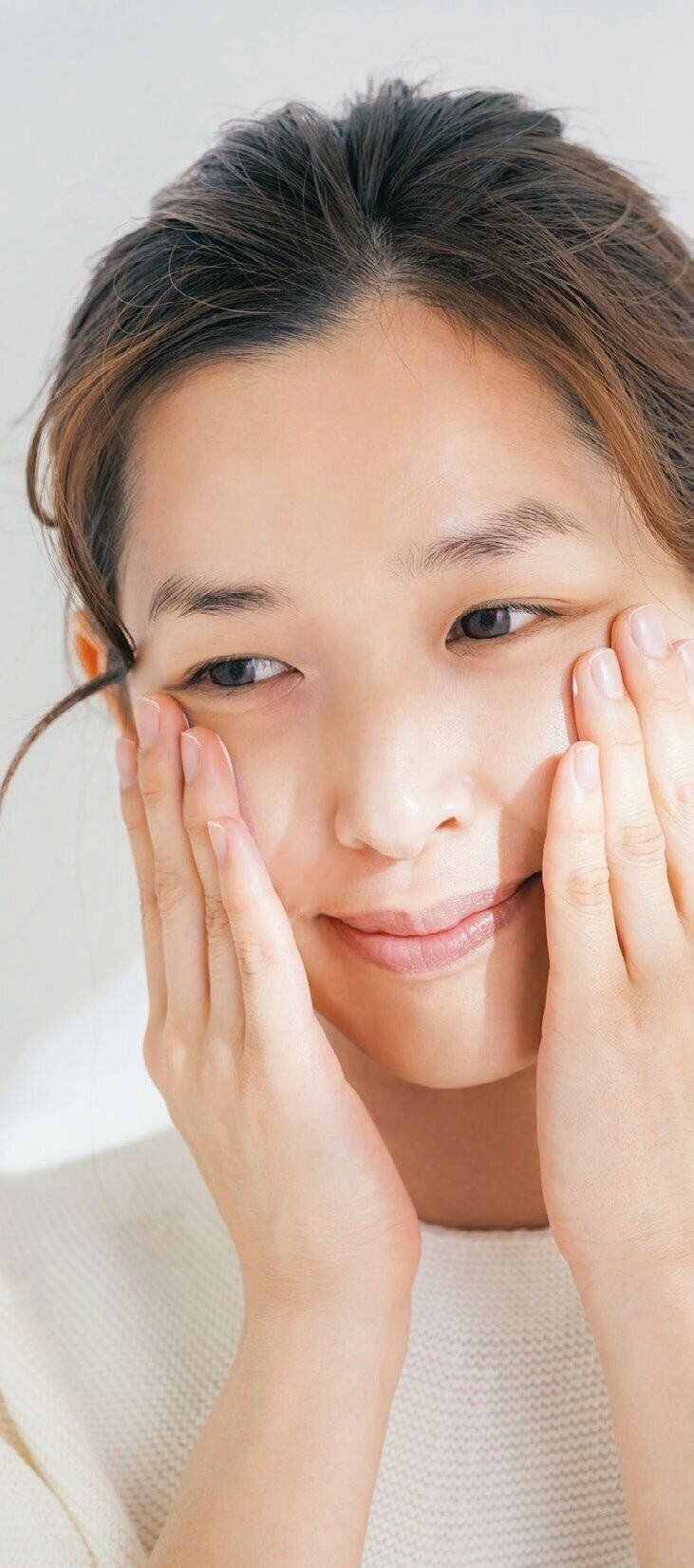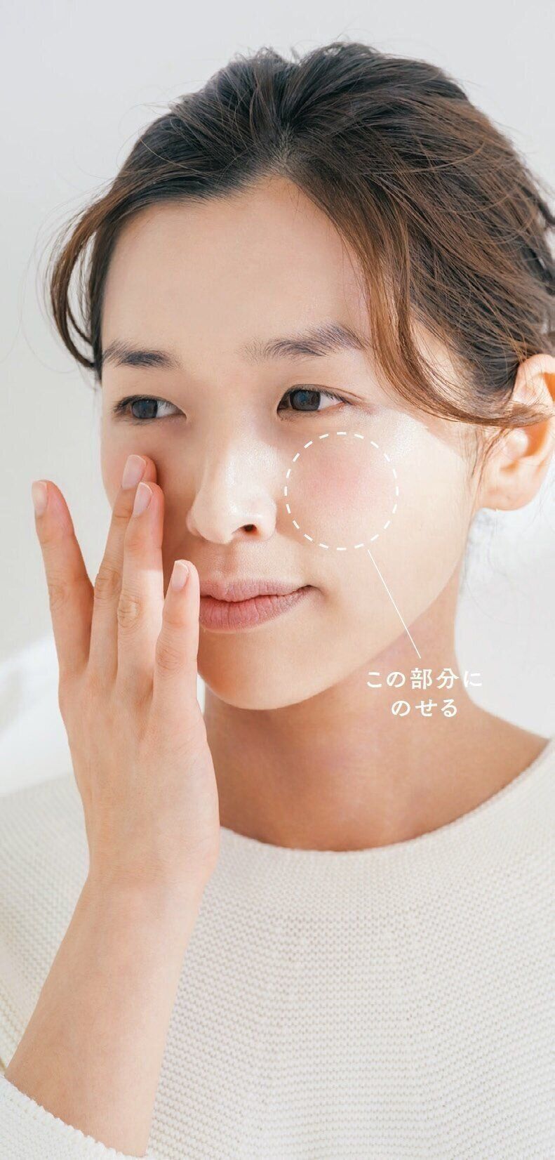 重ねるほどメイクがくずれる混合肌さんはファンデを省略。色つき下地を頰の高い部分から手でトントンとのせ、顔全体に広げて。