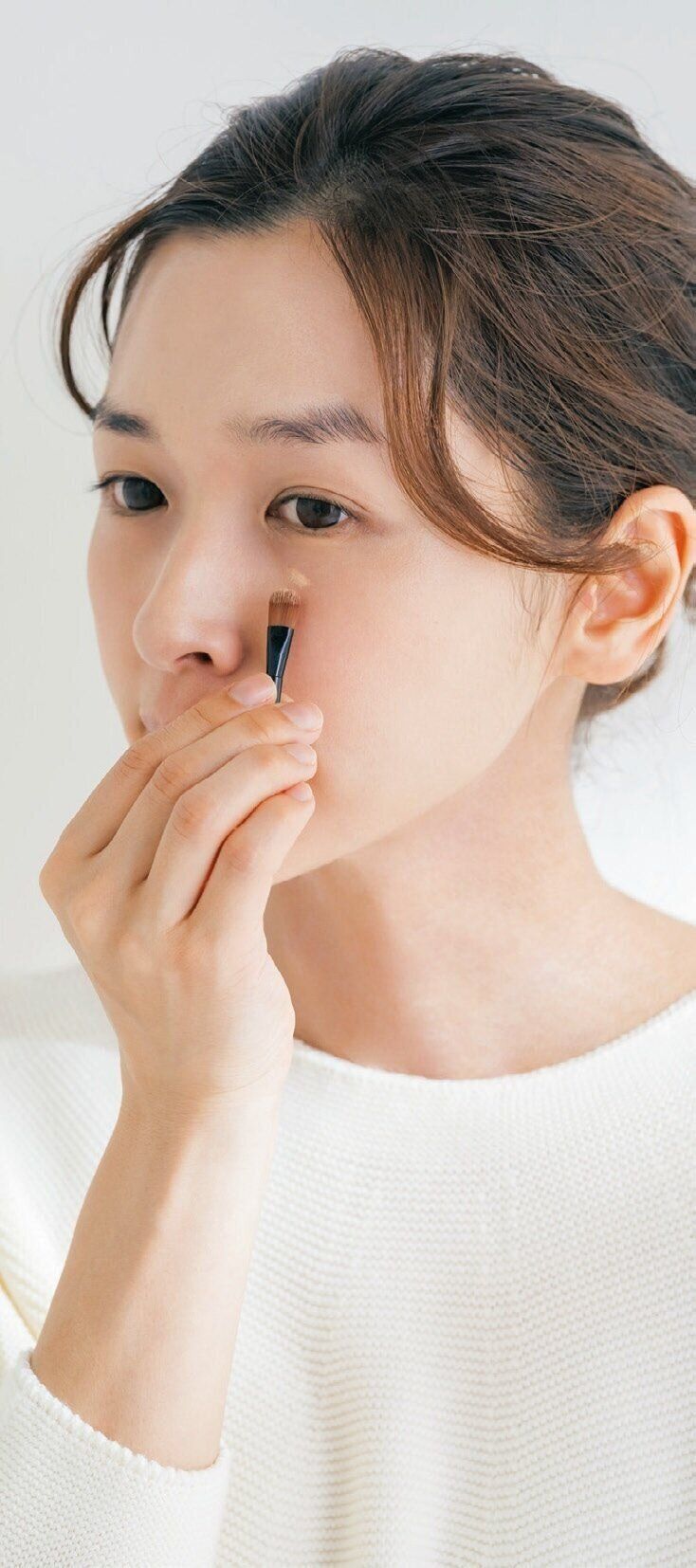 薄茶系のシミが点在する乾燥肌はオレンジ系、濃いシミが出やすい混合肌は一発でカバーできるコンシーラーを選択。つけた後、ブラシでこすらないようにトントンなじませる。