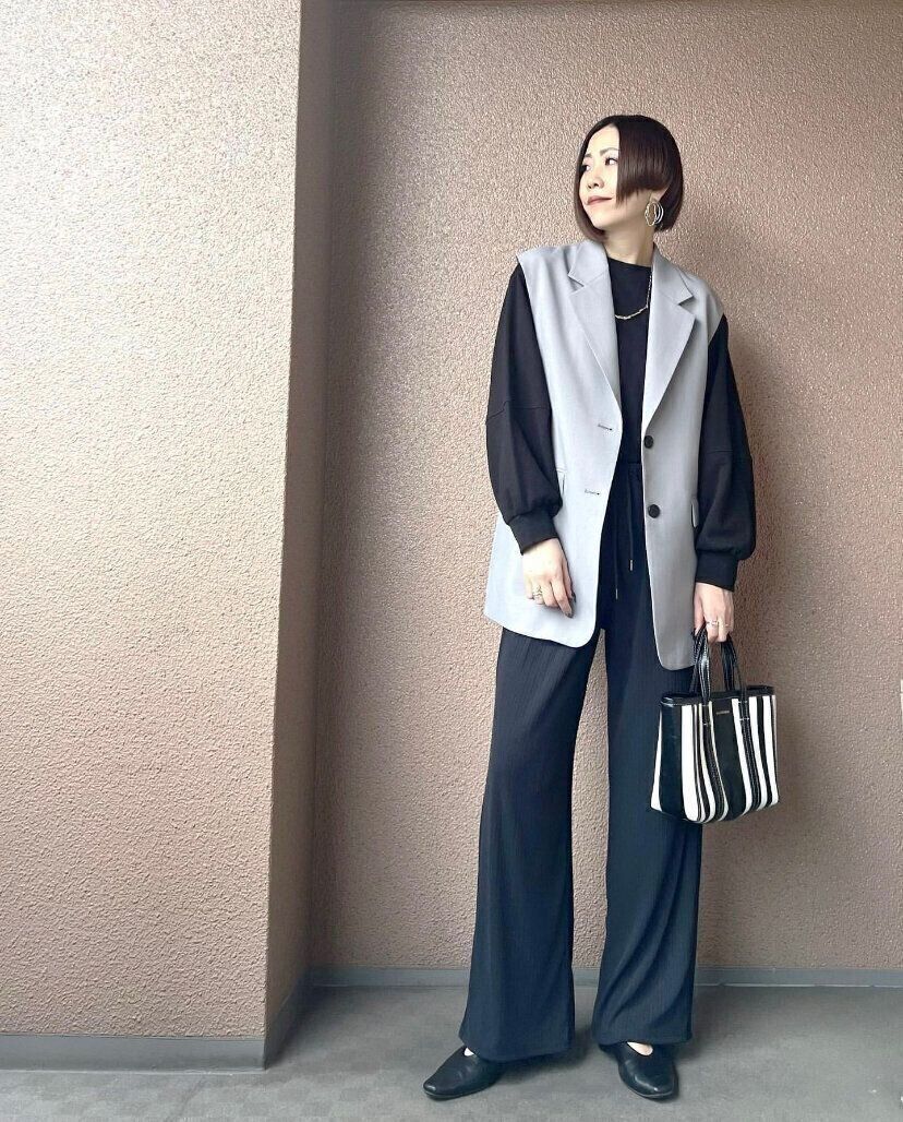 ボトムスとワントーンでまとめた「ミニ裏毛オーバーサイズT」にジレを合わせる事で、きっちり感もある大人カジュアルコーディネートが完成します。ブラウスではなくあえてミニ裏毛オーバーサイズTを合わせることでファッションに抜け感がプラスされ、あか抜けた印象を与えてくれます。