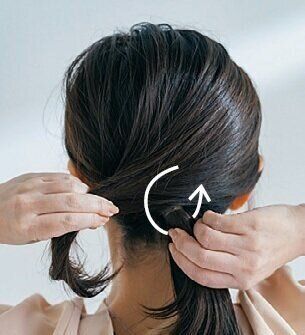 STEP2で分け取った毛束を結び目に巻きつけて別のゴムで結ぶ。するとトップがふんわり。巻きつけた毛束を少し引き出してゴムを隠せば完成。