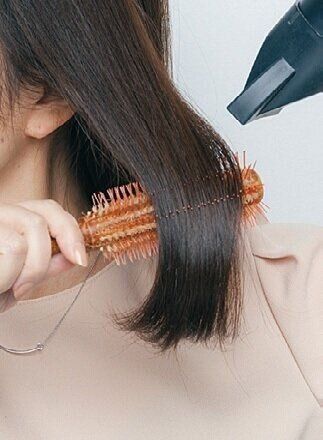根元をふんわりさせたら、ロールブラシを髪にかませ、軽く下に引きながら温風を当てて、毛先に丸みを。