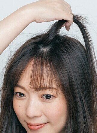 分け目のパックリ割れを解消しつつフワッとさせるために、生え際から指を入れて、2cm幅にジグザグに動かしながら髪を分ける。