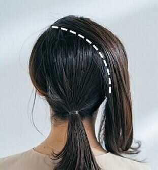 トップから耳後ろに向かって斜めに毛束を分け取り、下の髪は細いゴムで結ぶ。写真のように耳下ラインより低めの位置で結ぶと今っぽい。