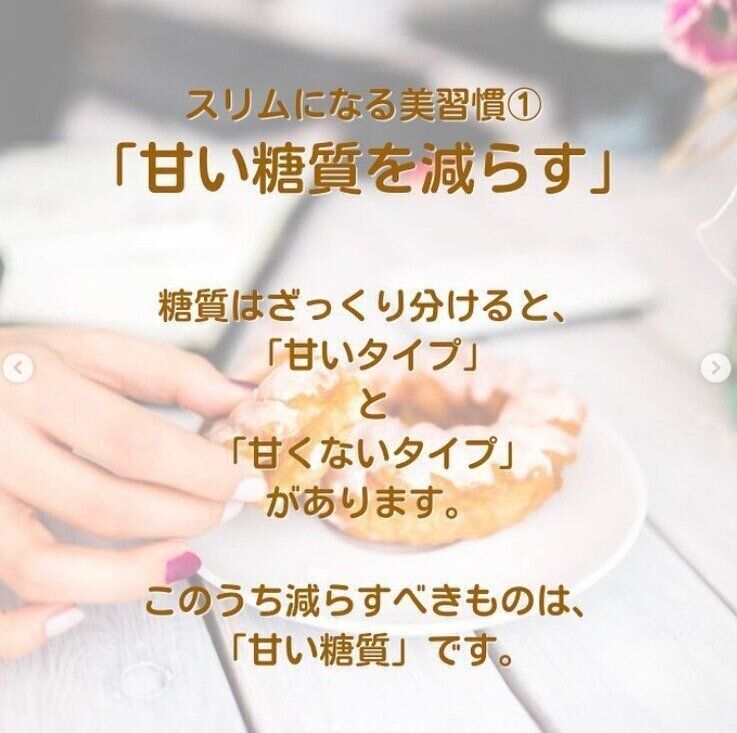 「糖質は、ざっくり分けると『甘いタイプ』と『甘くないタイプ』があります」といいます。このうち減らすべきものは「甘いタイプ」。ごはんなどの糖質ではなく、スイーツなどの糖分を控えているのだそう。