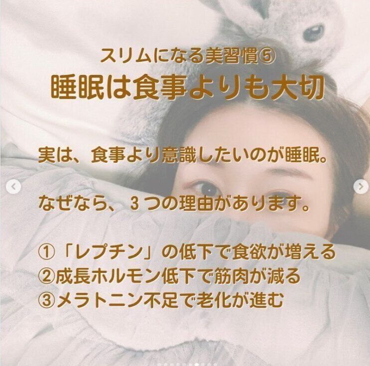 じつは、「食事よりも意識したいのは睡眠」だといいます。睡眠が不足すると食欲が増えたり、成長ホルモンの低下で筋肉が減ったり、老化が進むといわれているのだそう。「睡眠は食事よりも大切です」といいます。