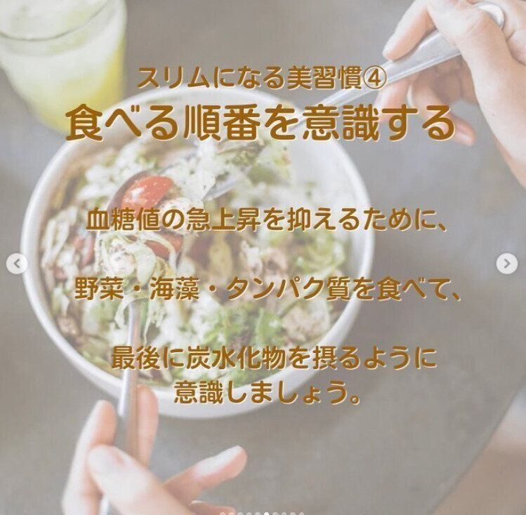 血糖値の上昇をおさえるために、食べる順番を意識してみましょう。野菜、海藻、タンパク質を先に食べて、最後に炭水化物を摂るように意識するといいのだそう。