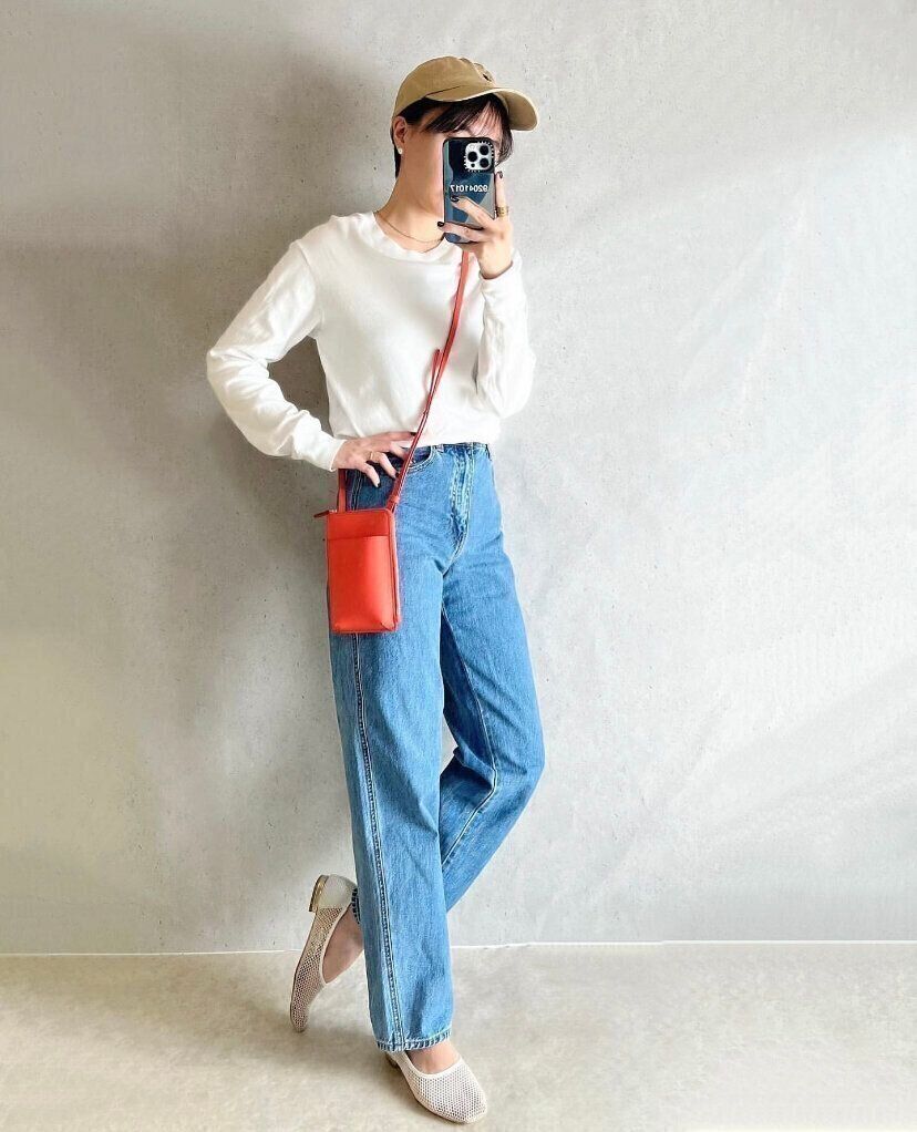 ホワイトパンツだとインナーのラインなどが透けてしまう心配もあるのですが、カーブジーンズはお尻まわりはゆったりとしているデザインなのでインナーを気にする必要がないのもうれしいポイントです。